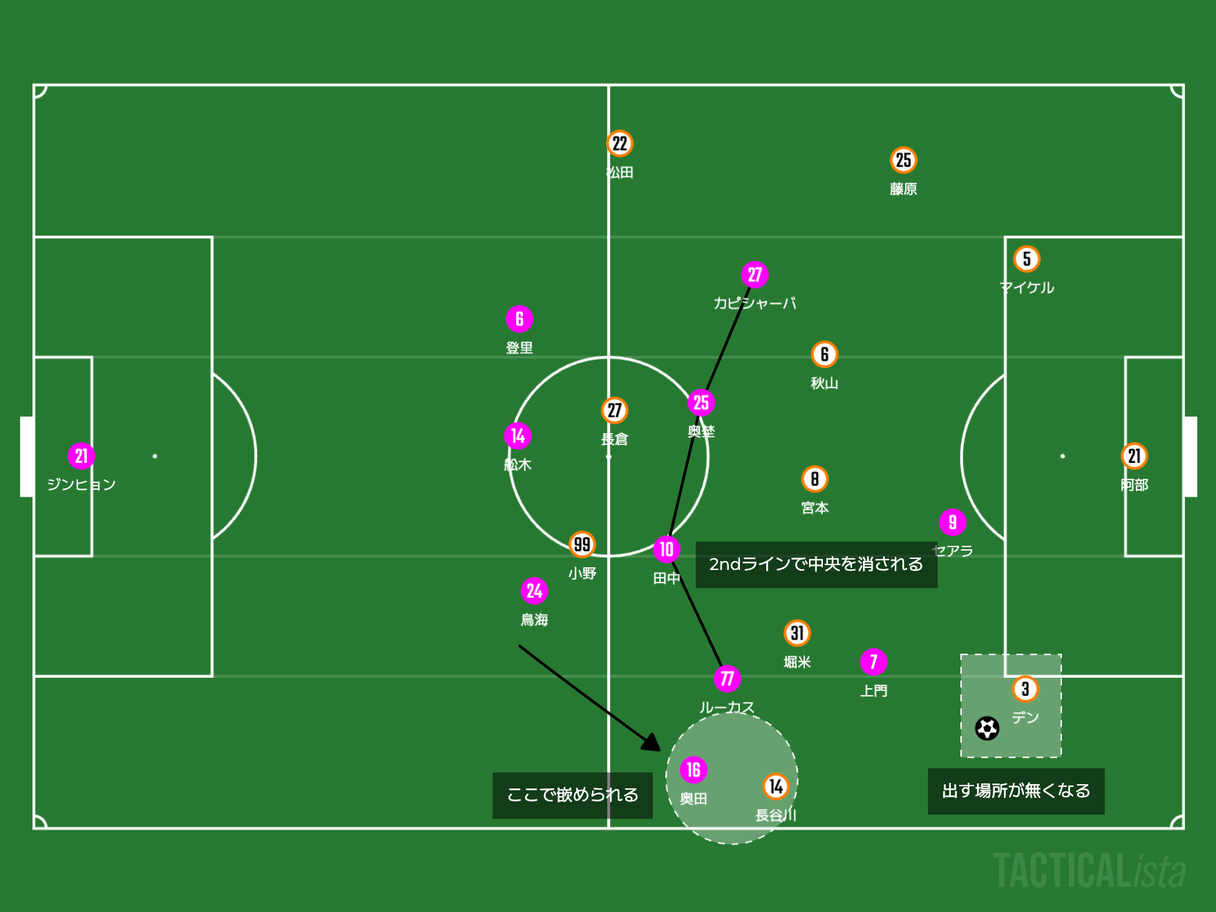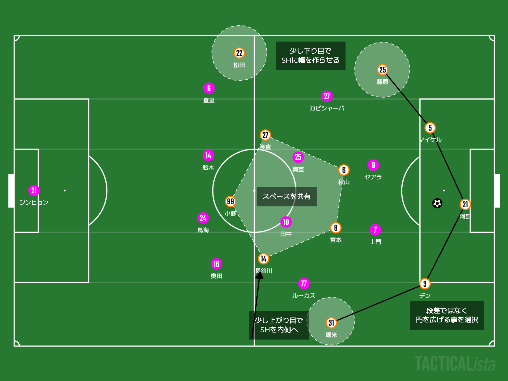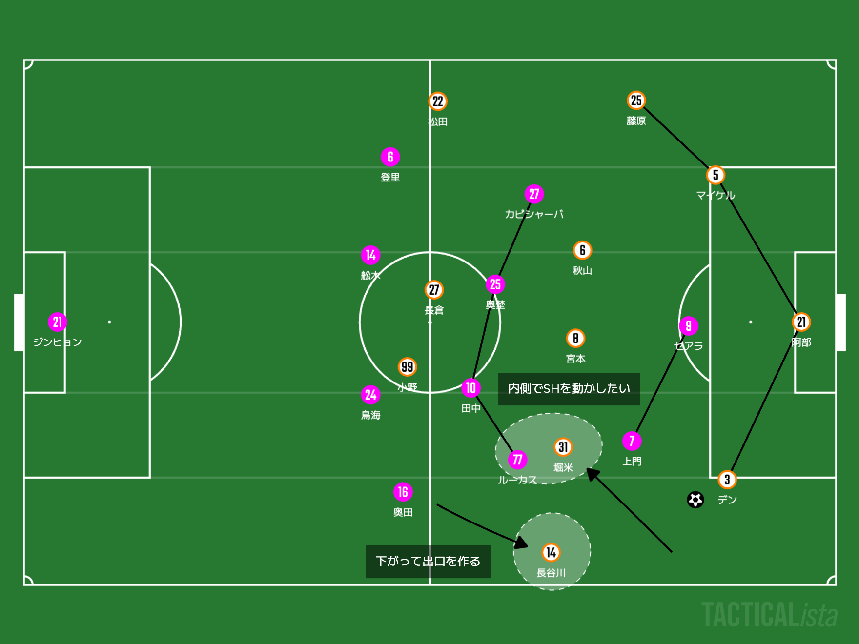 このようにCFとSHの門を広げた先に立つのがSHの長谷川選手で彼が壁となって、CHでレイオフを作り出します。これができるのはCBで1stプレスラインを、そして内側に入ったSHで田中選手や奥埜選手に影響を与えたことで、MF−FWのライン間を広げることができたからです。
