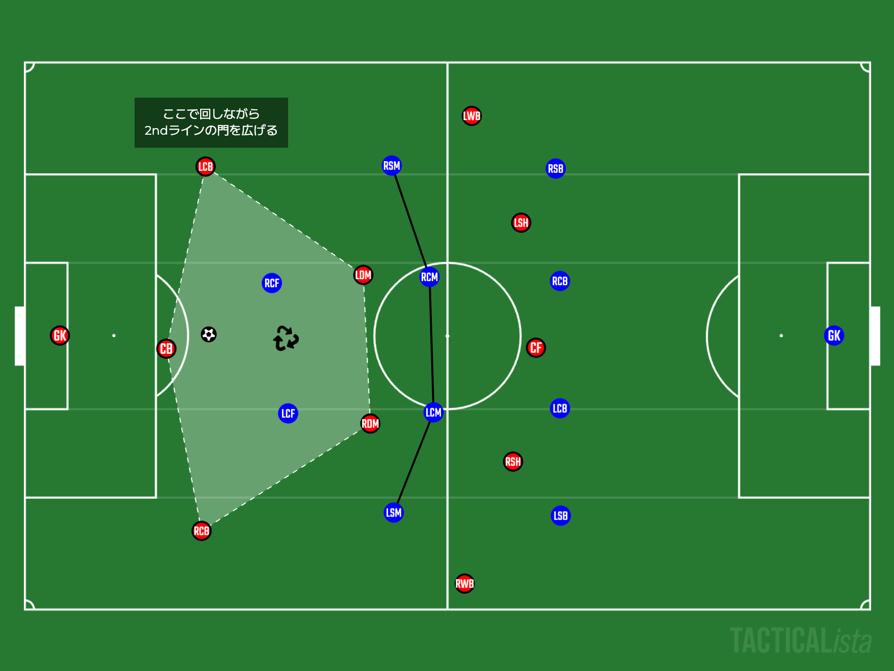 大崎選手の加入によって3−2の土台と4−1の土台の行き来がスムーズになりました。この行き来は矢印を自分たちに向けるのではなく、きちんと対戦相手ありきで考えられています。だからこそ3−2と4−1の使い分けができ、影響を与える事が出来る土台を選択できるようになりました。