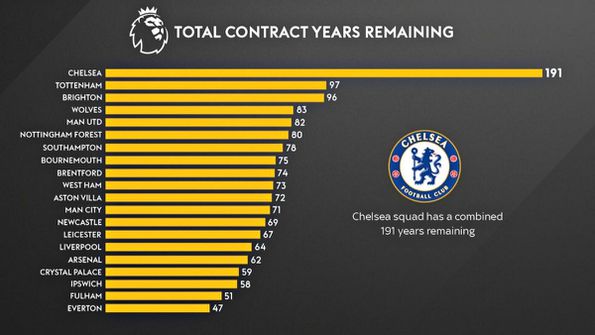 『Sky Sports』によれば、チェルシーは、保有するトップチーム選手42人との残り契約年数が合計で191年もあるそう。