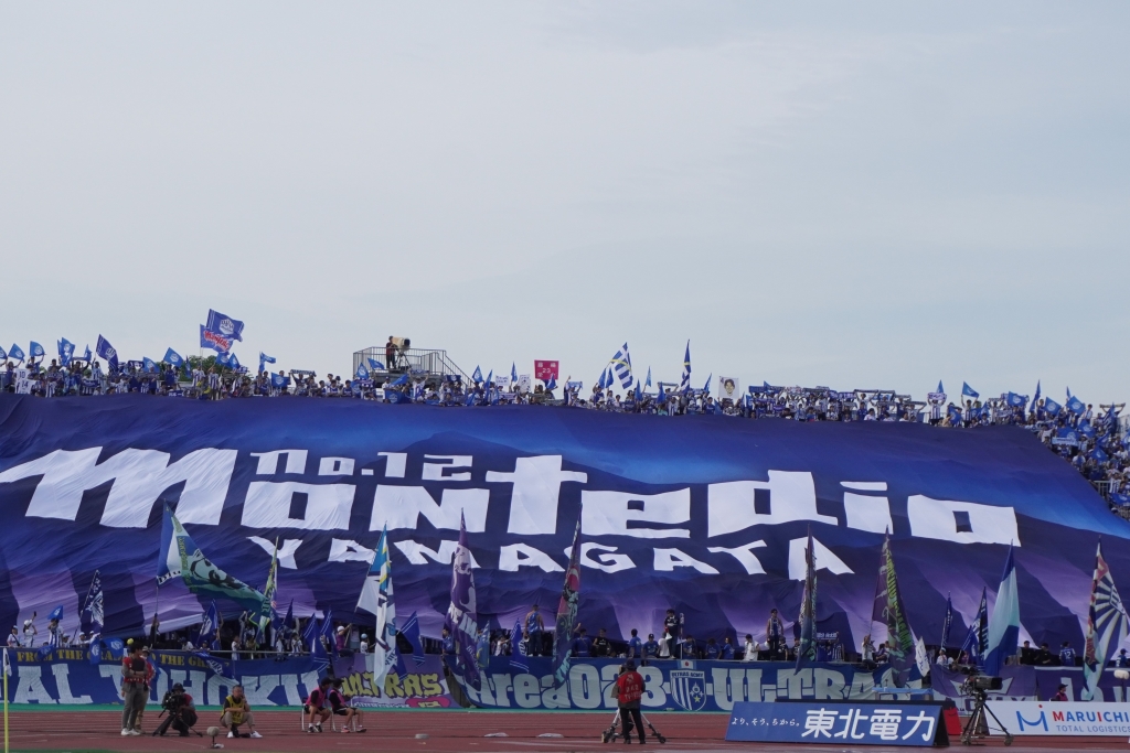 山形といえば傑作チャント『PARK』が有名だ。チームに勢いをもたらす歌を熱唱する山形サポーターはまさに青と白の壁であり、相手に与える圧力はすさまじいものがある。美しい絶景の中に、熱きサポーターたちの叫びも見応えがある。
