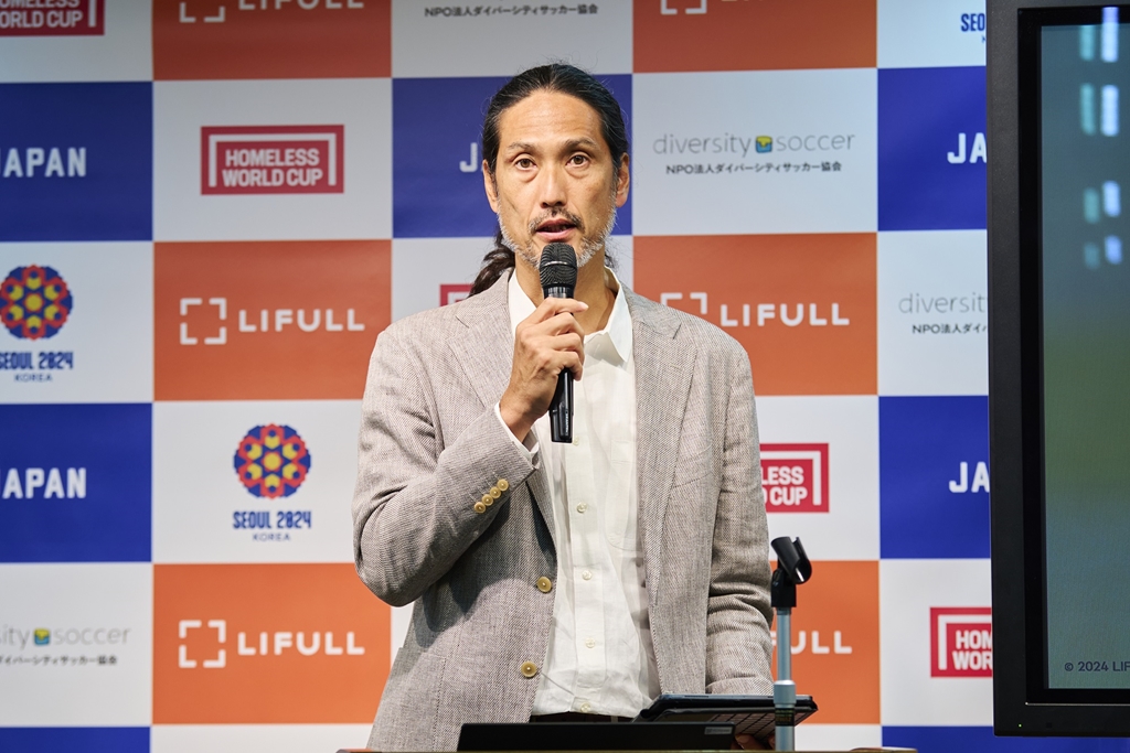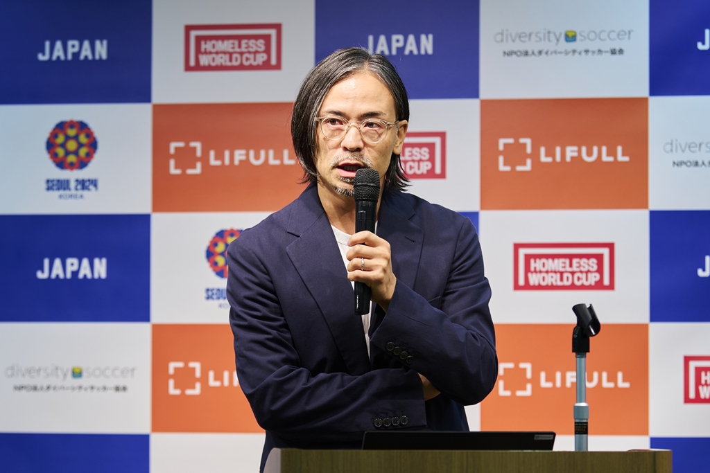 会見では、ダイバーシティサッカー協会の鈴木直文理事がホームレス・ワールドカップの2つのミッション「ホームレスを経験した人の人生や生活を変えること」「ホームレス問題に対する偏見や無理解を是正すること」を説明。