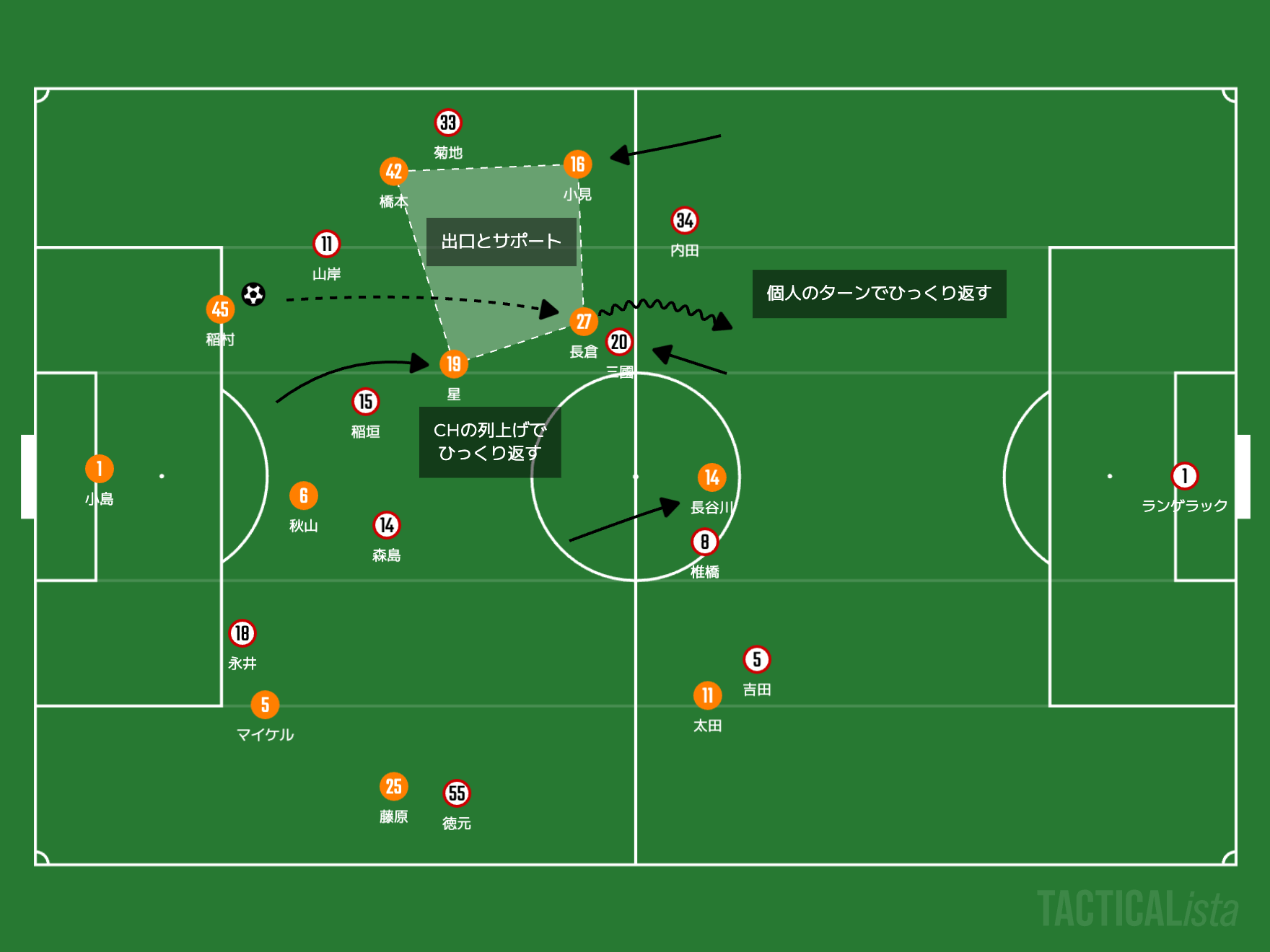 そして縦パスを引き取るのが長倉幹樹や長谷川元希になるでしょう。特に長倉幹樹は予備動作を加えながら、CBの力を利用してターンする技術が存外に上手いです。ここの単独のターンと、CHの列上げによるサポートで、迎撃をいなす、プレスの力を折っていくことは可能になりそうです。