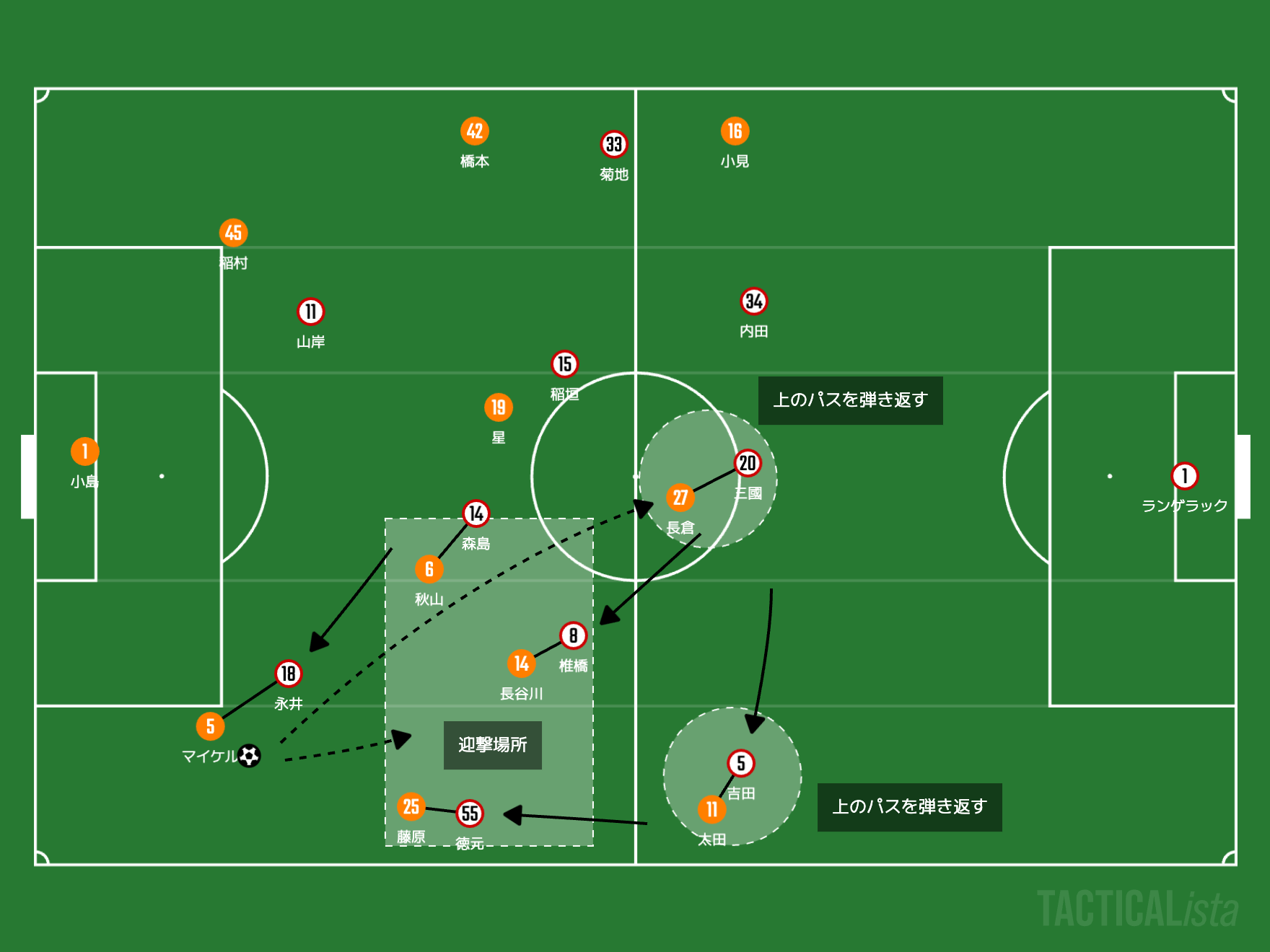 この手前の迎撃と上のパスの弾き返しが可能になっているのは、やはりCBへの牽制と制限があるからです。なるべく『CBに良い選択をさせない』ようにプレッシングをかけていくことで、この守備は成り立っていると思います。