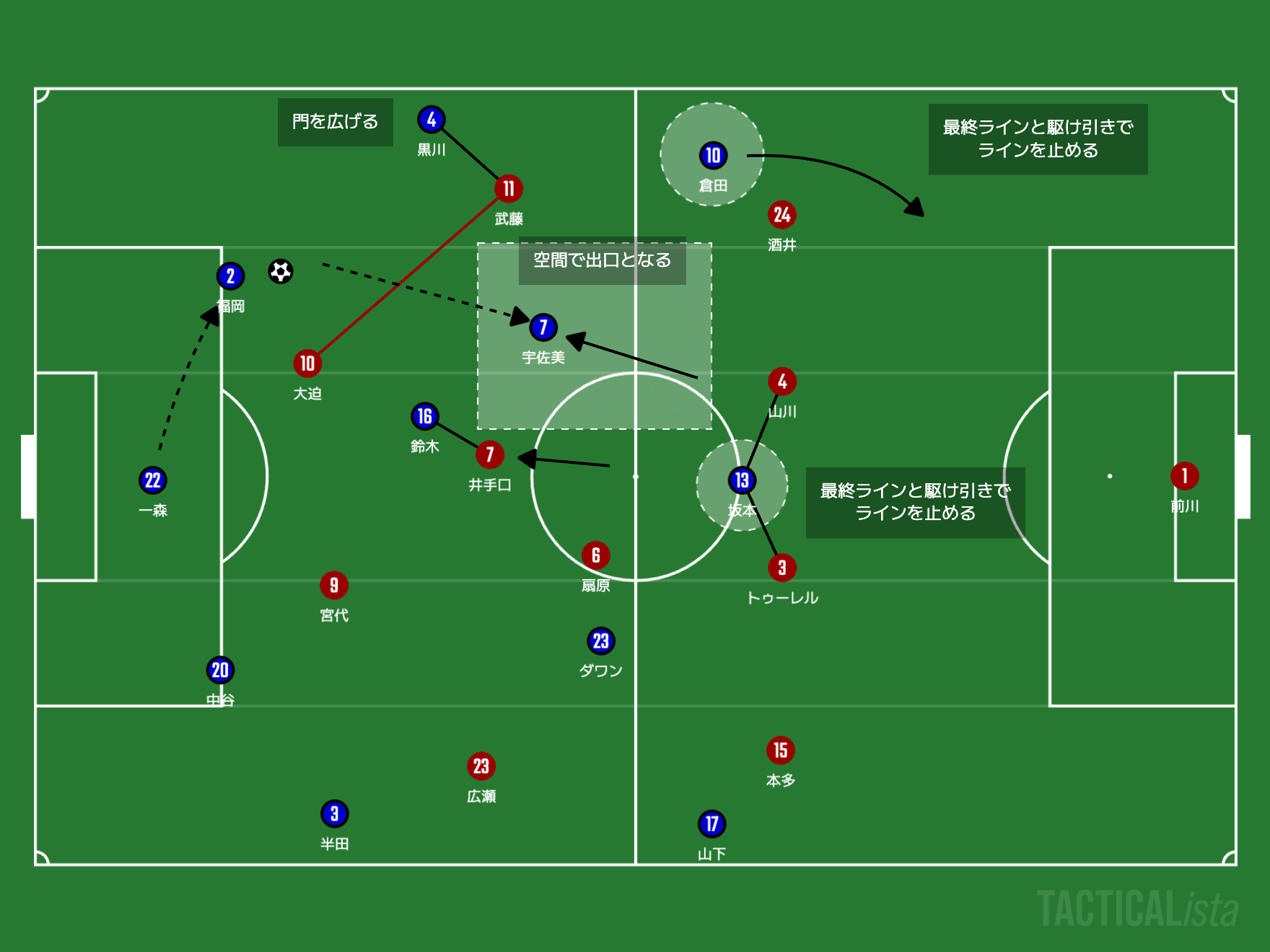 宇佐美貴史も坂本一彩もここに入ってくるタイミングがとても上手く、さらにマーカーのベクトルを利用しながらボールをキープする事が存外に上手いです。ぜひとも注目して欲しい局面の一つです。