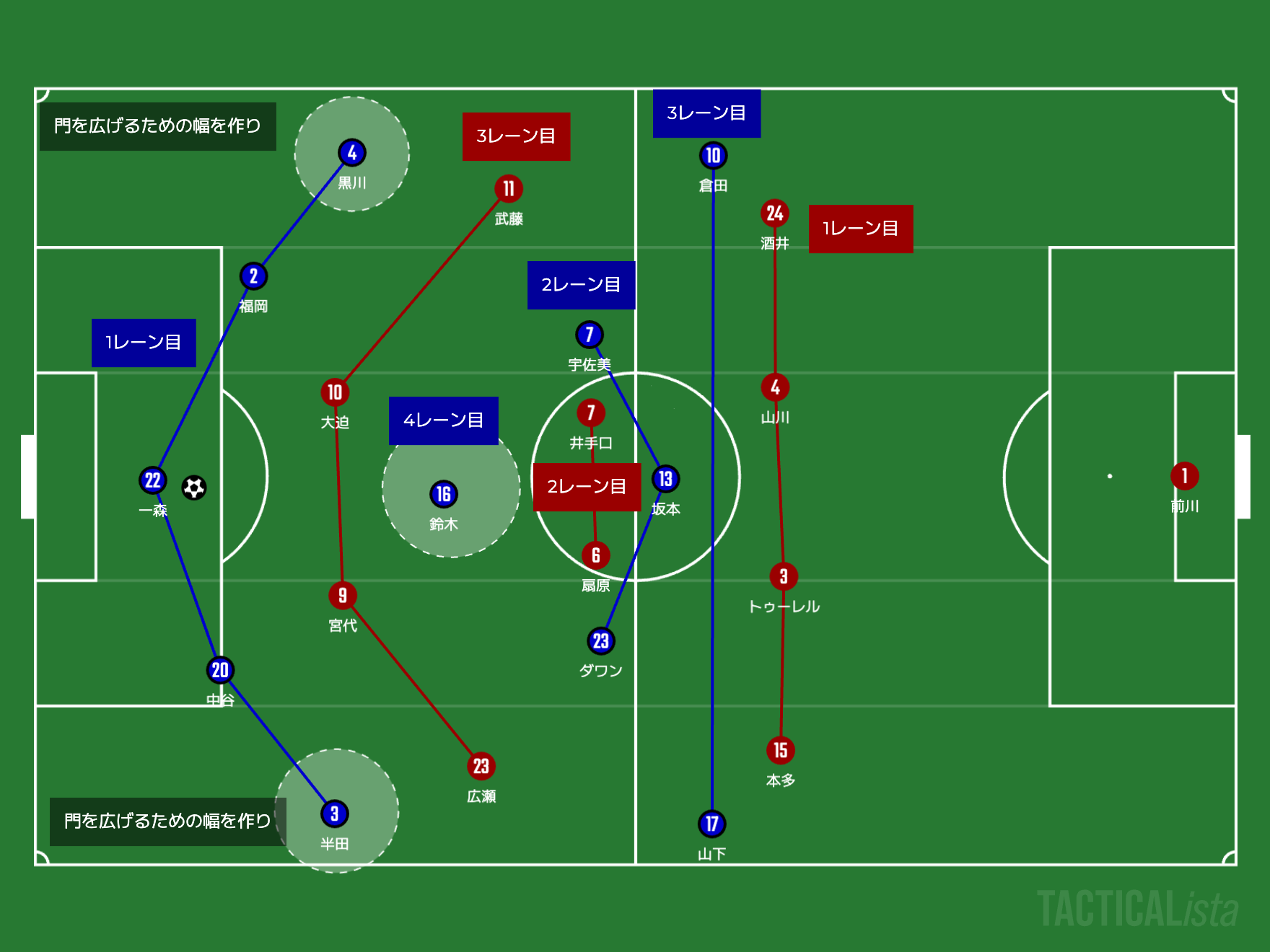 ヴィッセルの3ラインに対して、ガンバは4ラインを作ることで、呼吸場所を作り出します。門を広げてここに届け続けると、ガンバはヴィッセルのプレッシングを空転させる事ができます。