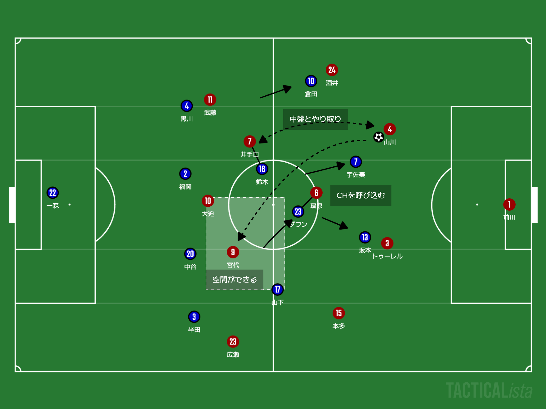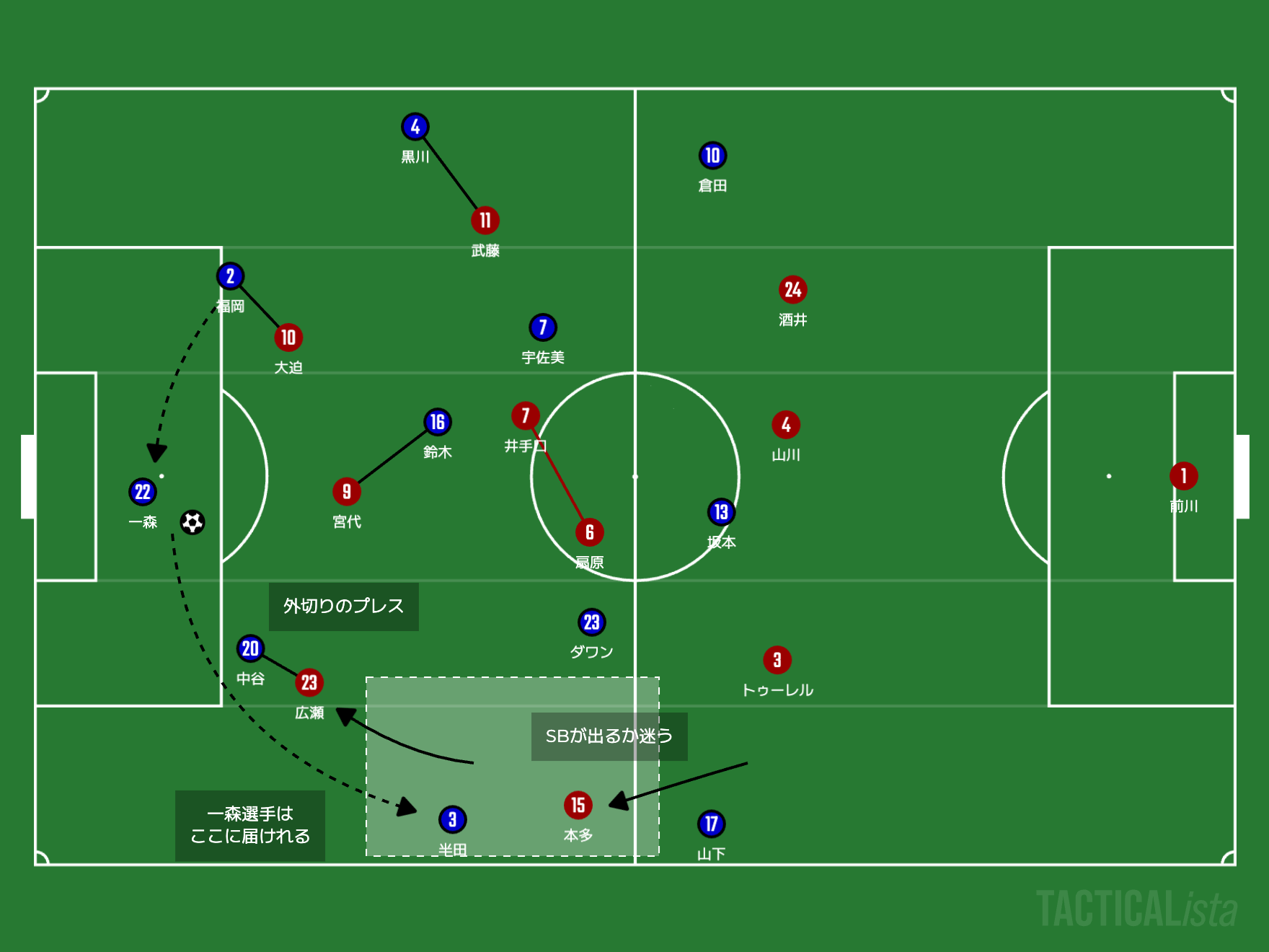 ここで起点を作りながらサイドを取りにいき、クロスからのフィニッシュの試行回数を増やしていけば、自然とゴールに近づくと僕は予想します。
