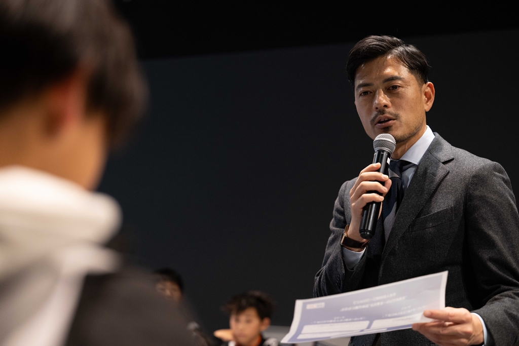 ワークショップの開催にあたり、KDDIの坂本伸一(ブランドコミュニケーション本部ブランドマネジメント部部長)は、「私たちKDDIは、みなさんとともに、2030年に『つなぐチカラを進化させ、誰もが思いを実現できる社会をつくる』ことを目指しています。みなさんと一緒に日本サッカーの未来を描いていきたいと思います」と参加した子どもたちに挨拶。