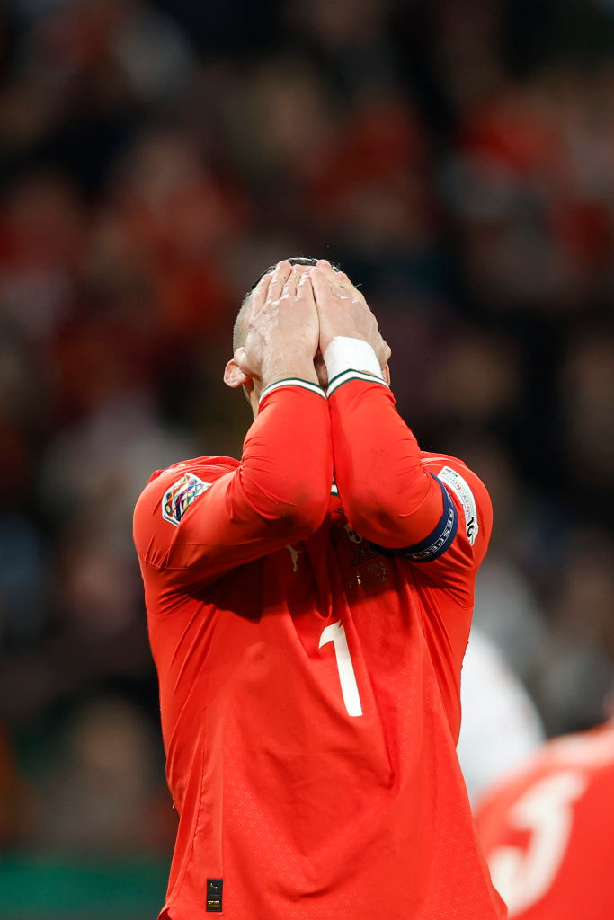 ロナウドは前半6分に自ら得たPKを蹴るも、38歳のGKカスパー・シュマイケルに阻止されて得点ならず、思わず顔を覆っていた。