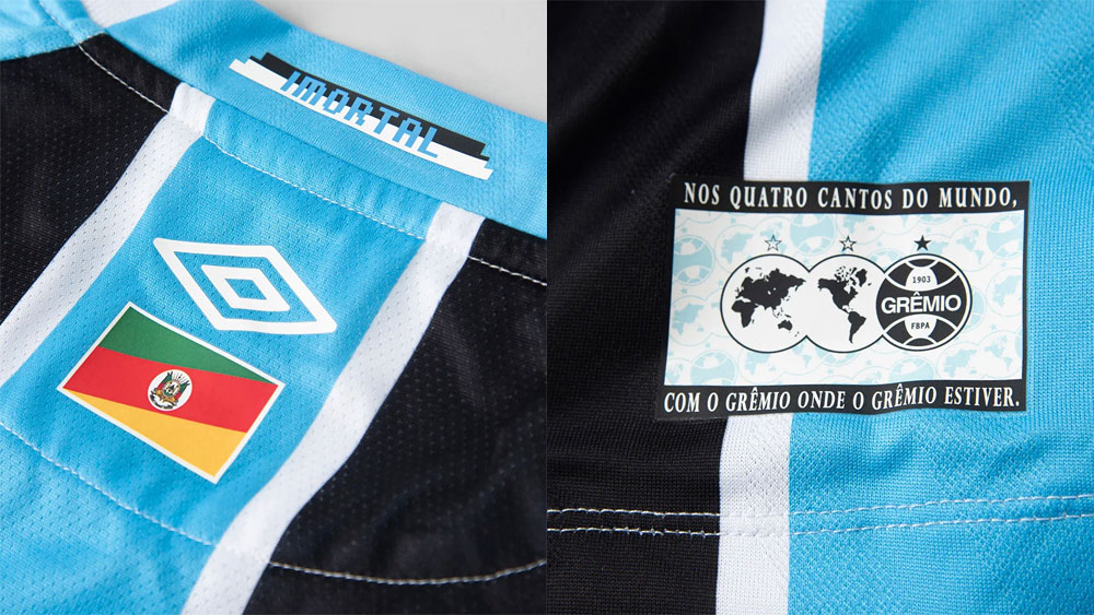 背面の襟部分には不滅を意味する“Imortal”を特徴的なフォントデザインでレタリング。Umbroロゴマークの下にはホームタウンのポルト・アレグレが属するリオグランデ・ド・スル州の旗を配置し、チームのルーツを明確に表した。