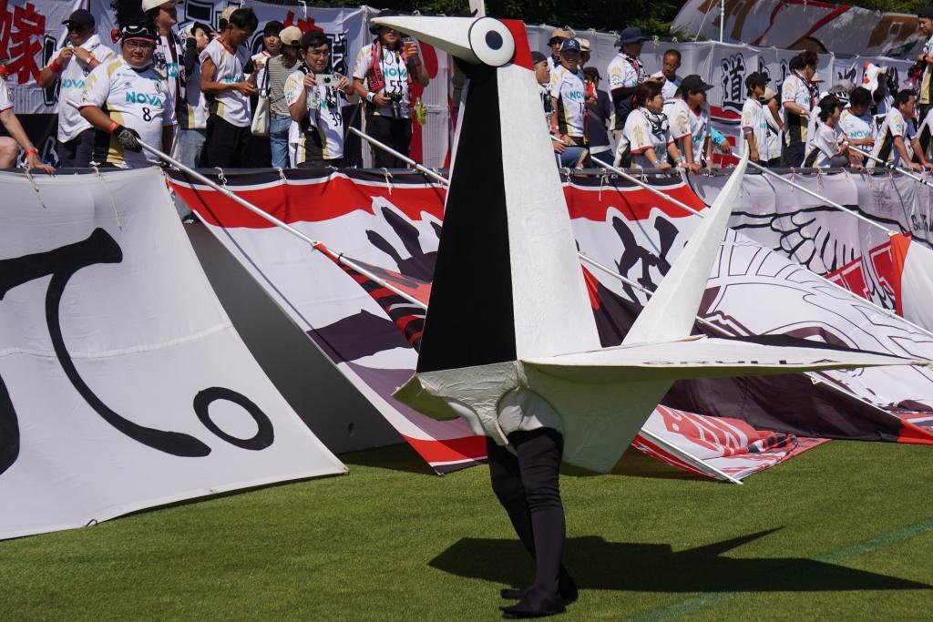 折り鶴から着想を得てデザインされた角ばった姿は、他チームのマスコットと比べても類を見ない。