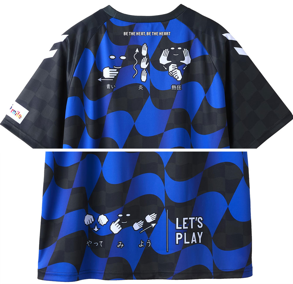 背面は、上部に“BE THE HEAT , BE THE HEART”(青い炎となり、熱狂を生み出し、中心となる)のクラブスローガンを、「青い炎」と「熱狂」の手話で表現。